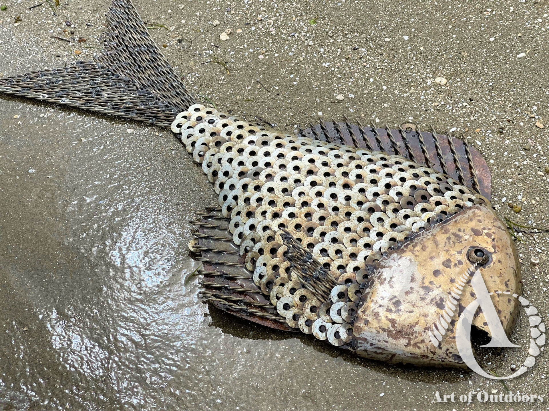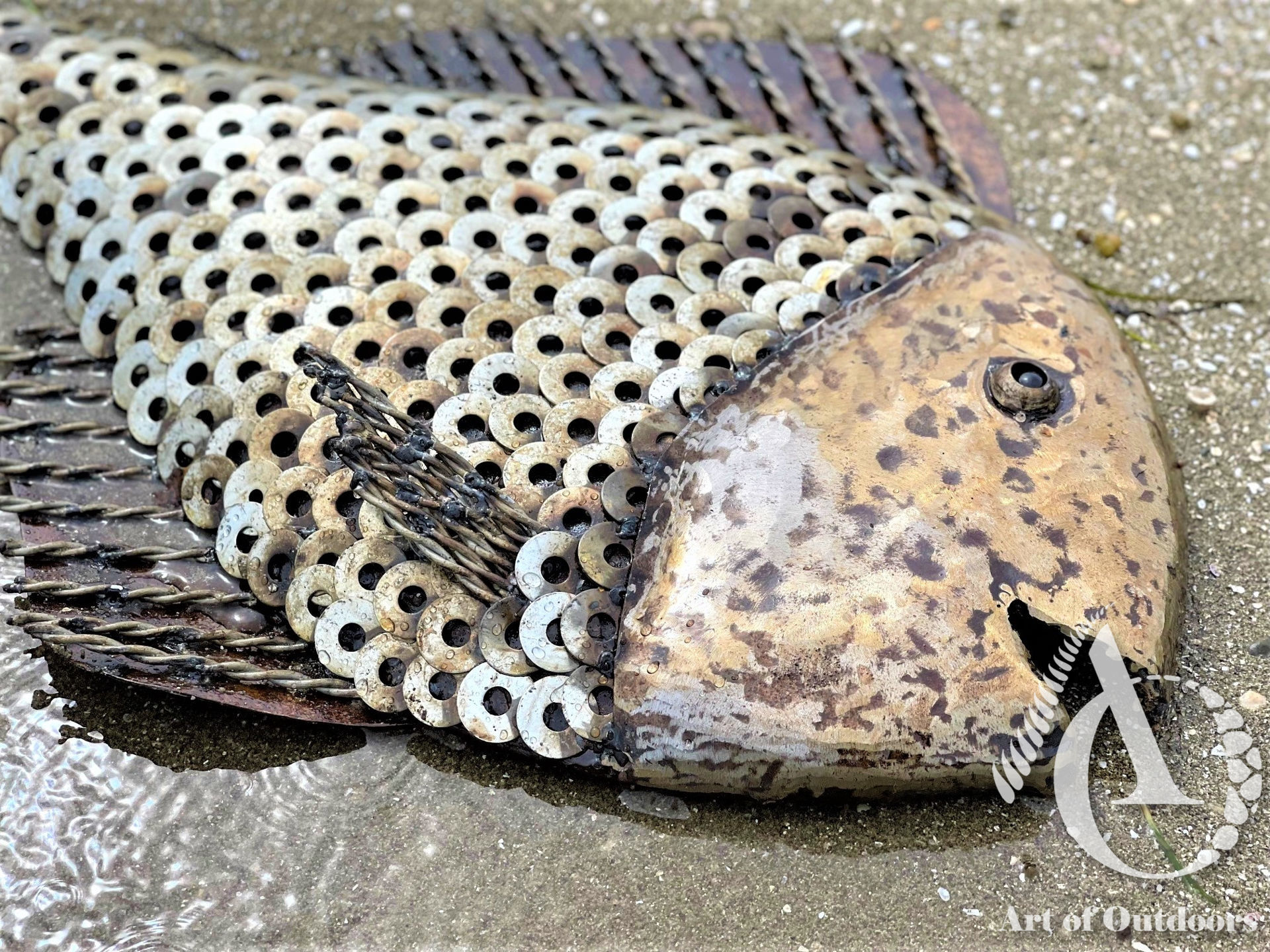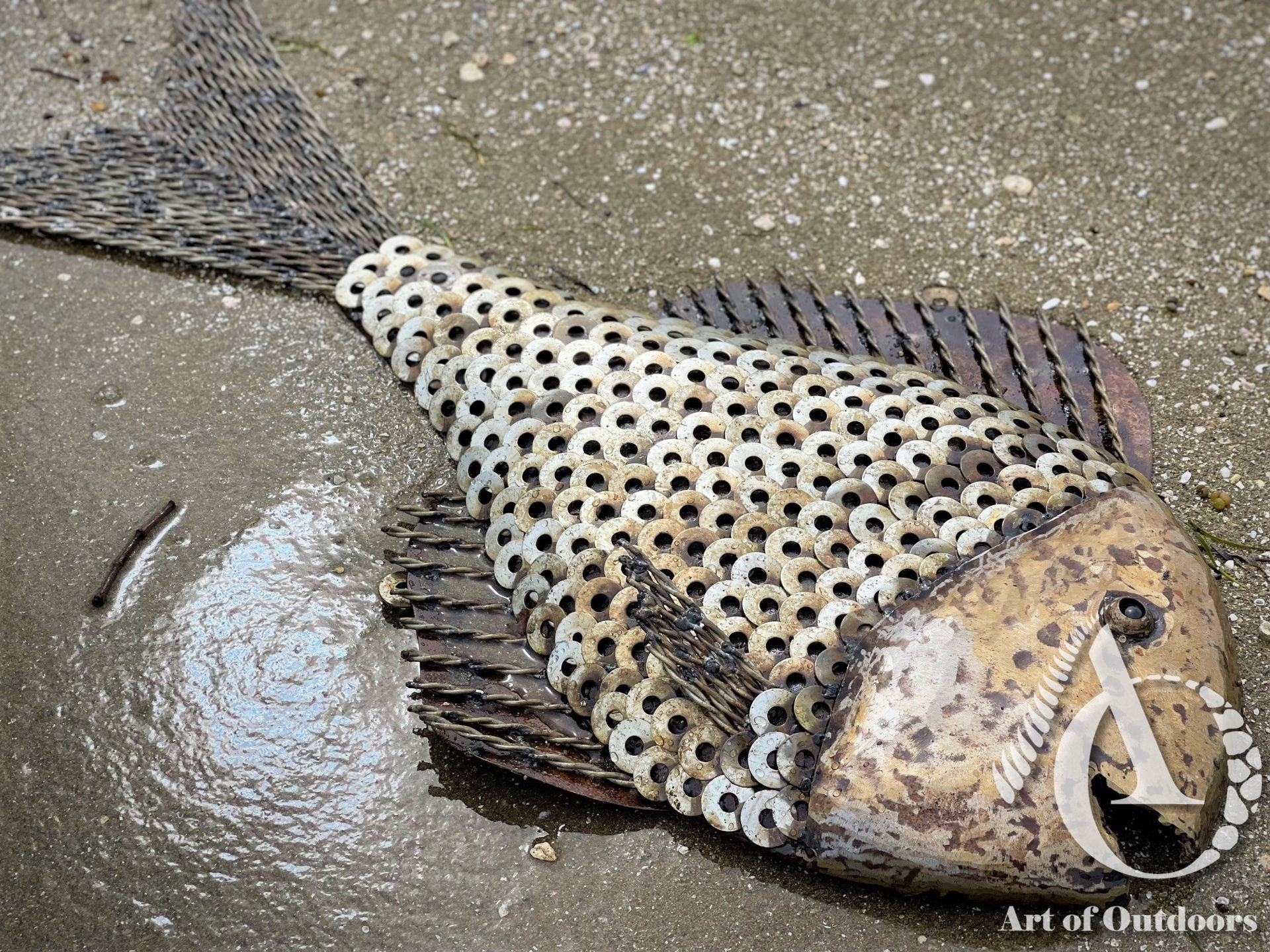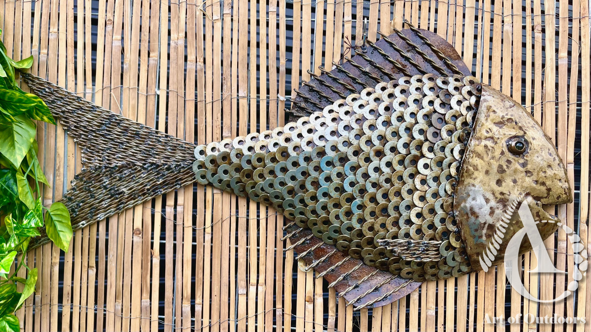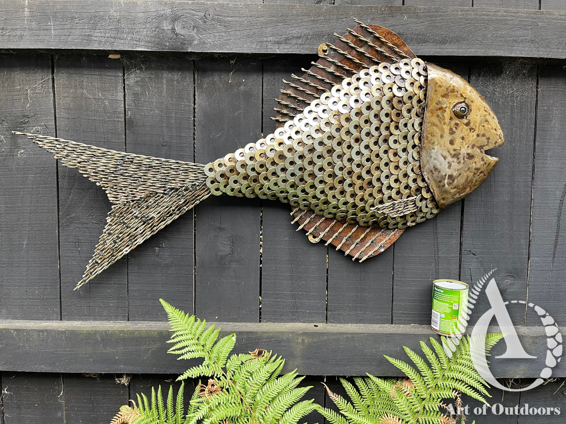 Our Washerback Snapper is a standout favourite — a striking wall‑mounted sculpture handcrafted from recycled scrap metal. Its distinctive “scale” pattern is created from individually welded washers, giving the piece remarkable texture, depth, and visual interest.
